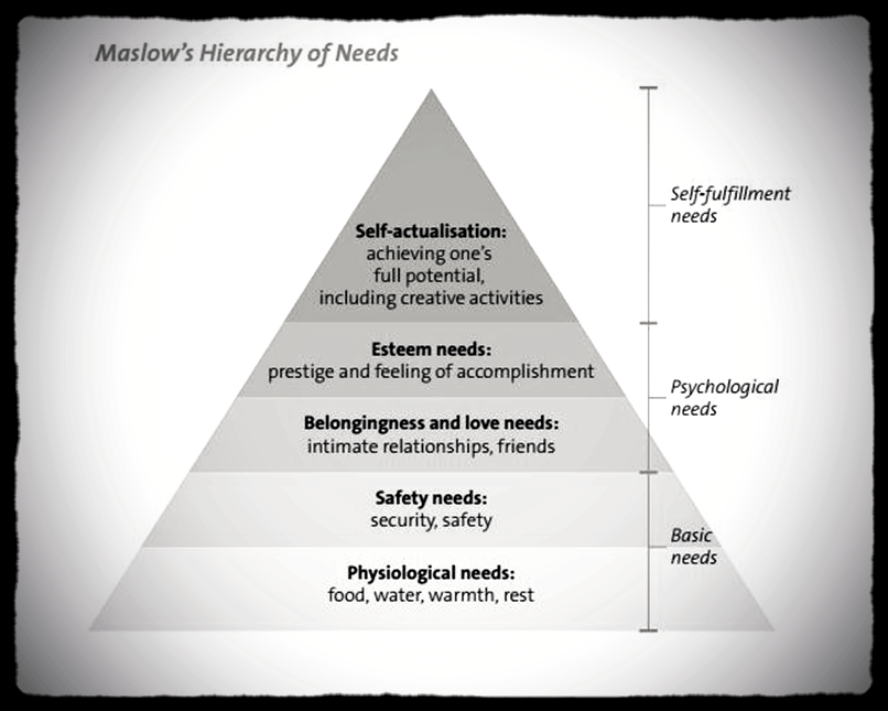 We look to Maslow’s pyramid for inspiration of our needs. What we want to ask God for, (He already knows) but we should also remember that everyone has these needs. Following J’s logic, if we love ourselves enough to eat when hungry, then we should love others enough to feed them when THEY are hungry. At least we can understand and forgive them when they lash out from lack of these things.