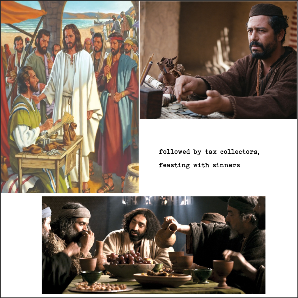 New disciple is called: Levi the tax collector. And Jesus’ crew of followers included “disreputable people”… religion scholars and Pharisees didn’t like that either. But Jesus stood by them and considered himself as a doctor to the sin sick. (Mark 2:13-17)