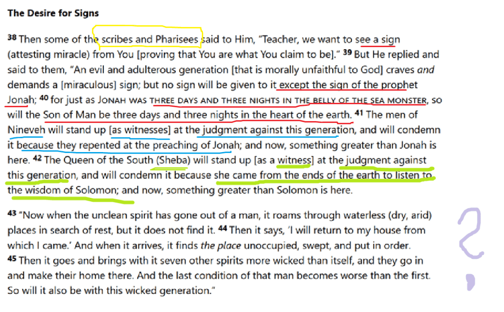 Imagine a court where ghostly ancestors stood as witnesses to cast judgement on the current generation. (Boomers vs Gen Z?) Well, the people of Nineveh would think this generation of self-righteous hypocrites and reporters are…wrong/idiots(?) Because in their time they knew and believed in the Lord and he saved them. And they’d been shown far less! The signs Jesus had already shown wouldn’t even be necessary and they wouldn’t be there asking for more signs.