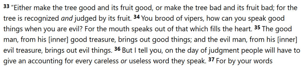 Jesus and his disciples went through some grainfields on Sabbath. They were hungry so they ate and the Pharisees saw it and had a problem with it. Those religious leaders said they weren’t allowed to do that on Sabbath. Jesus reminded them of when David was hungry and had to eat the showbread that was only meant for priests and how “hey, you know how its legal for priests to work in the temple on sabbath?” I’m sure it was getting annoying dealing with them, so he repeated something he’d said earlier “I desire mercy and not sacrifice.” —Leaving the grainfield, J went to their synagogue where there was a man with a withered hand. Those pharisees tested him, saying “you’re not really gonna do work on him on Sabbath, are you?!” And Jesus points out, if you had a sheep fall into a pit on Sabbath, wouldn’t you save it? And a human has more value than a sheep, so why WOULDN’T I help him?” So he healed the guy and the Pharasees lost it. They definitely had to plot to destroy him. —Jesus knew of their hostility so he got out of there. Multitudes followed him and he healed them too, but he said “hey guys, don’t rat me out! I have a destiny to fulfill.” —There was a blind and mute man who Jesus cured and made able to speak and see. The pharisees saw this and were talking crap saying that Jesus was only able to do these things by the power of Satan. In response, J was like “that doesn’t make sense. If I’m with him, why would I be fighting against him? And your sons (his disciples he empowered?) how would they have the power to cast out the spirits? It makes more sense that I do these things in the name of God, which means you would have to accept that the kingdom of God is here before you thought it would be. I could only overcome these things by being stronger than them. (And Jesus is stronger than demons) —The worst thing someone can do, according to Jesus in response to this accusation, is take credit from the Holy Spirit and attribute Its works to satan. Matthew 12:32 Whoever speaks a word against the Son of Man will be forgiven, but whoever speaks against the Holy Spirit will not be forgiven, either in this age or in the one to come. —Good begets good, bad begets bad. (12:33) –(The desire for signs 12:38) Some scribes/REPORTERS and Pharisees asked Jesus for signs, proof of his claims. He says no (though he’s BEEN giving all these signs), he says the only sign that will be given is that the son of man (himself) would go 3 days and 3 nights in the heat of the earth, just as Jonah was 3 days and nights in the belly of the sea monster! –Imagine a court where ghostly ancestors stood as witnesses to cast judgement on the current generation. (Boomers vs Gen Z?) Well, the people of Nineveh would think this generation of self-righteous hipocrites and reporters are…wrong, idiots? Because in their time they knew and believed in the Lord and he saved them. And they’d been shown far less. The signs Jesus had already shown wouldn’t even be necessary and they wouldn’t be there asking for more signs. And a picture is painted of a man who has a demon cast out of him, but then there’s NOTHING stopping that demon from coming back or bringing worse spirits with him. Because that man is empty. As Jesus tells the Pharisees, their generation will be like that man. But again, HE WAS EMPTY. If the Holy Spirit resides somewhere, then I don’t think unclean spirits really stand a chance. —As Jesus was talking to the crowds about this, his mother and brothers were outside asking to speak to him. But at this point, they had no special rank over anyone else who does the will of his father. His family was expanding.
