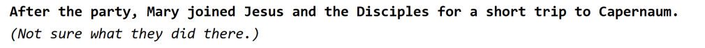 Previously: Jesus gained his disciples in Bethany (the Baptism spot) and the gang* made their way towards Galilee--near their hometowns. *Mary's Pov at the wedding: Jesus went to Bethany and came back with disciples...His time is near. After the party, Mary joined Jesus and the Disciples for a short trip to Capernaum. (Not sure what they did there.)